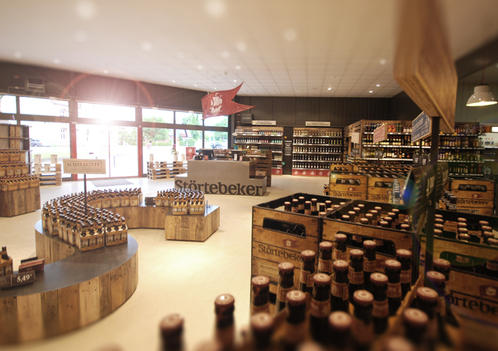 The market is located on the terrain of the manufactory in the Hanseatic city Stralsund. In order to provide an overall view on the award-winning beer specialties to the visitors, a "brand- arena" was constructed that consists of ordinary europallets in combination with steel and concrete.
