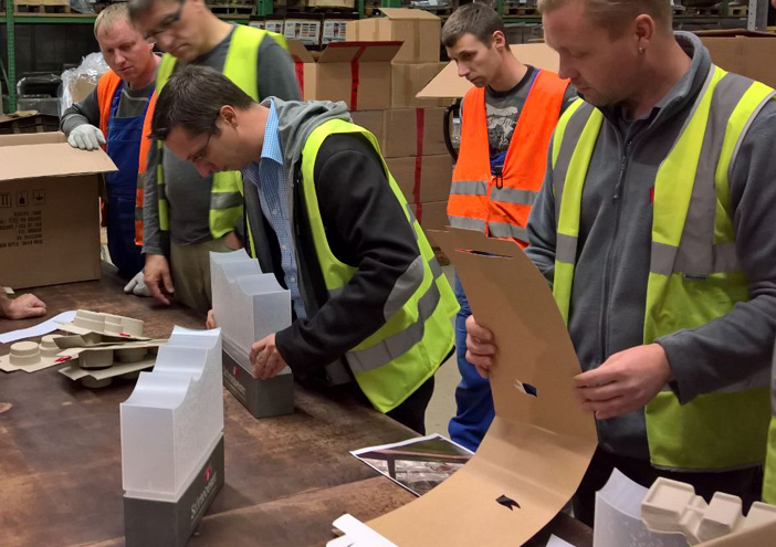 Die drei Hauptelemente der Elbphilharmonie - Speicher, Plaza und gläserner Aufsatz - finden ihre Entsprechung in einer stabilen Kartonage als Sockel und einer Haube aus transparentem, strukturierten Kunststoff in Form des extravaganten Dachs, das in die Plaza-Ebene übergeht. An die beidseitig erhabene rote Fahne lässt sich der Tragegriff einklinken, mit einer LED-Leuchte die Verpackung illuminieren.
