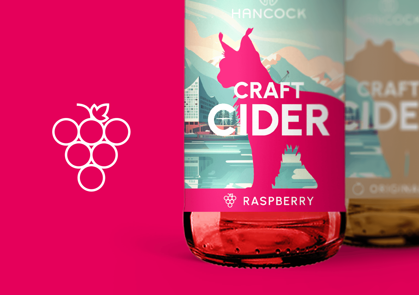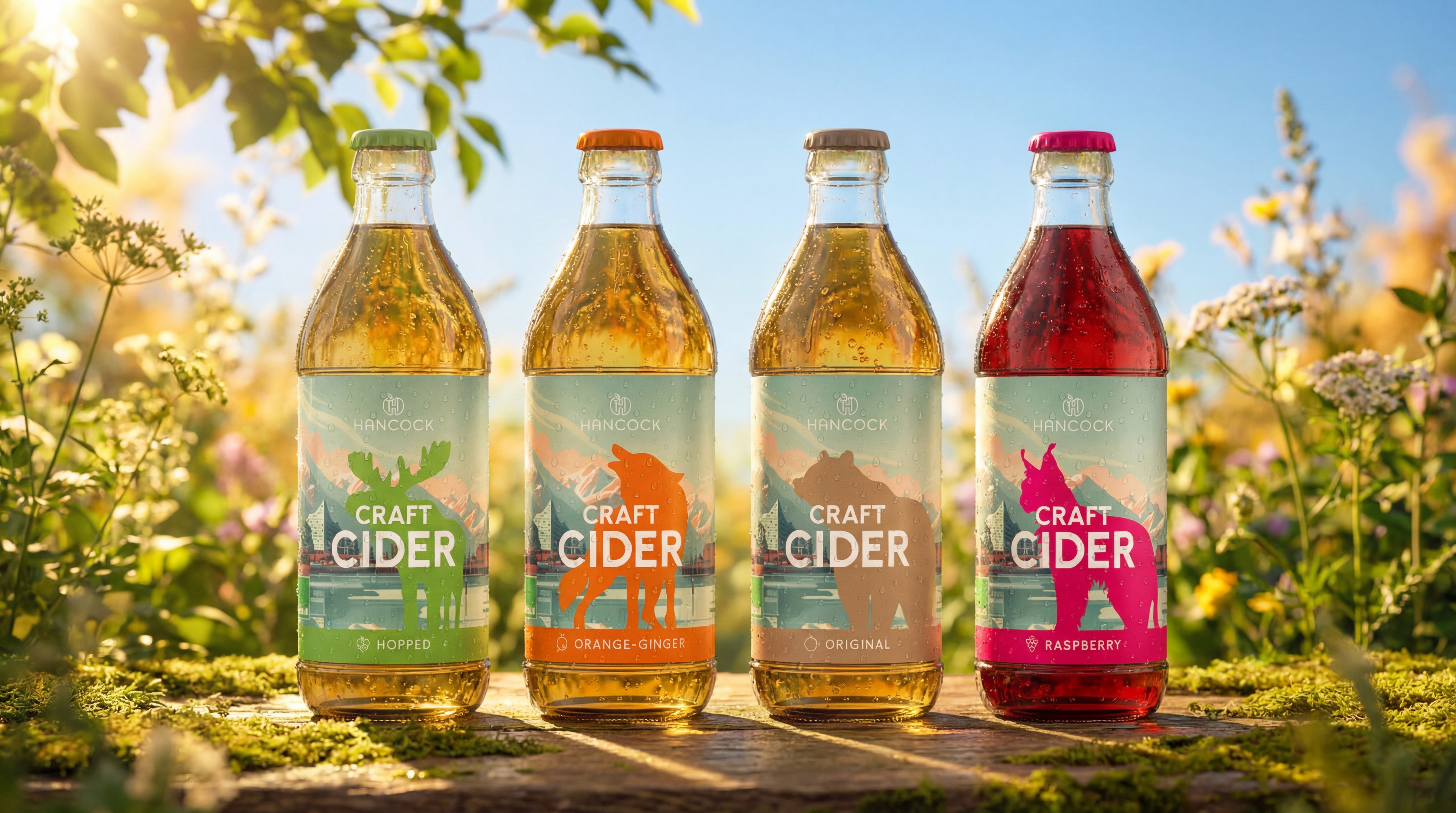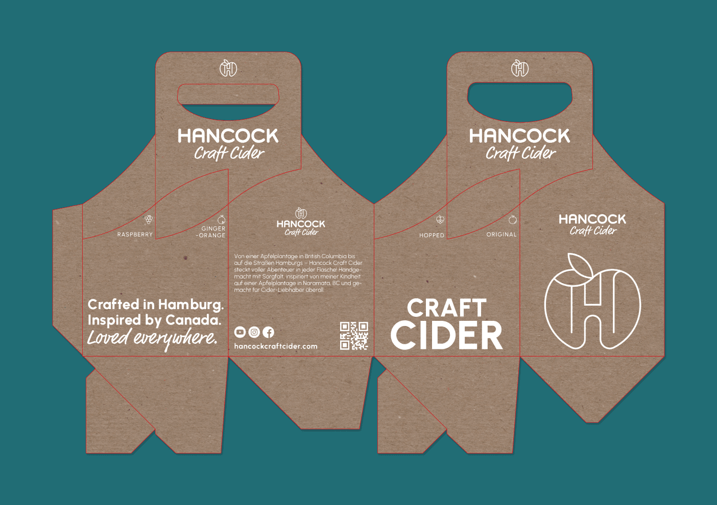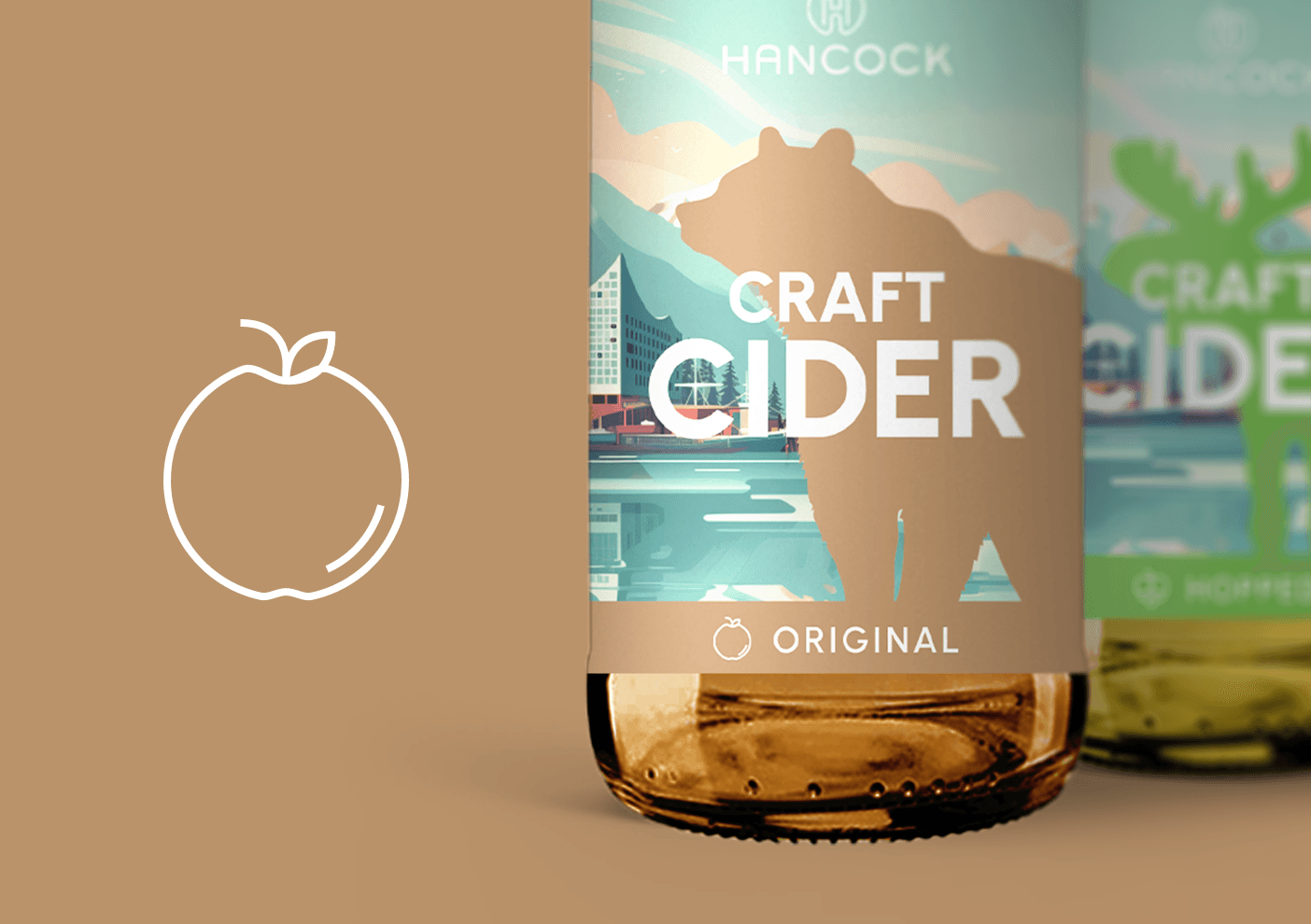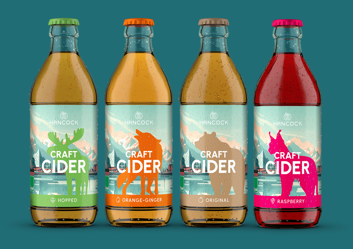 In diesem spannungsreichen Panorama wird jede der vier Sorten durch ein kraftvoll illustriertes kanadisches Tier repräsentiert, dessen Farbgebung harmonisch auf den Inhalt der Flasche abgestimmt ist. Eine plakative Groteskschrift rückt den Qualitätsanspruch „Craft Cider“ unübersehbar ins Zentrum. Doch das Design überzeugt nicht nur auf Distanz: Detailreiche Icons und Story-Elemente auf der Rückseite der Etiketten sowie auf der Website transportieren die Liebe zum Handwerk und die Geschichte hinter dem Produkt. Abgefüllt in der „kleinen Halben“ (0,33l), wird das Design durch ein bewusst reduziertes Fourpack aus naturbelassenem Craftkarton abgerundet – ein nachhaltiges Statement, das die Natürlichkeit des Produkts unterstreicht.