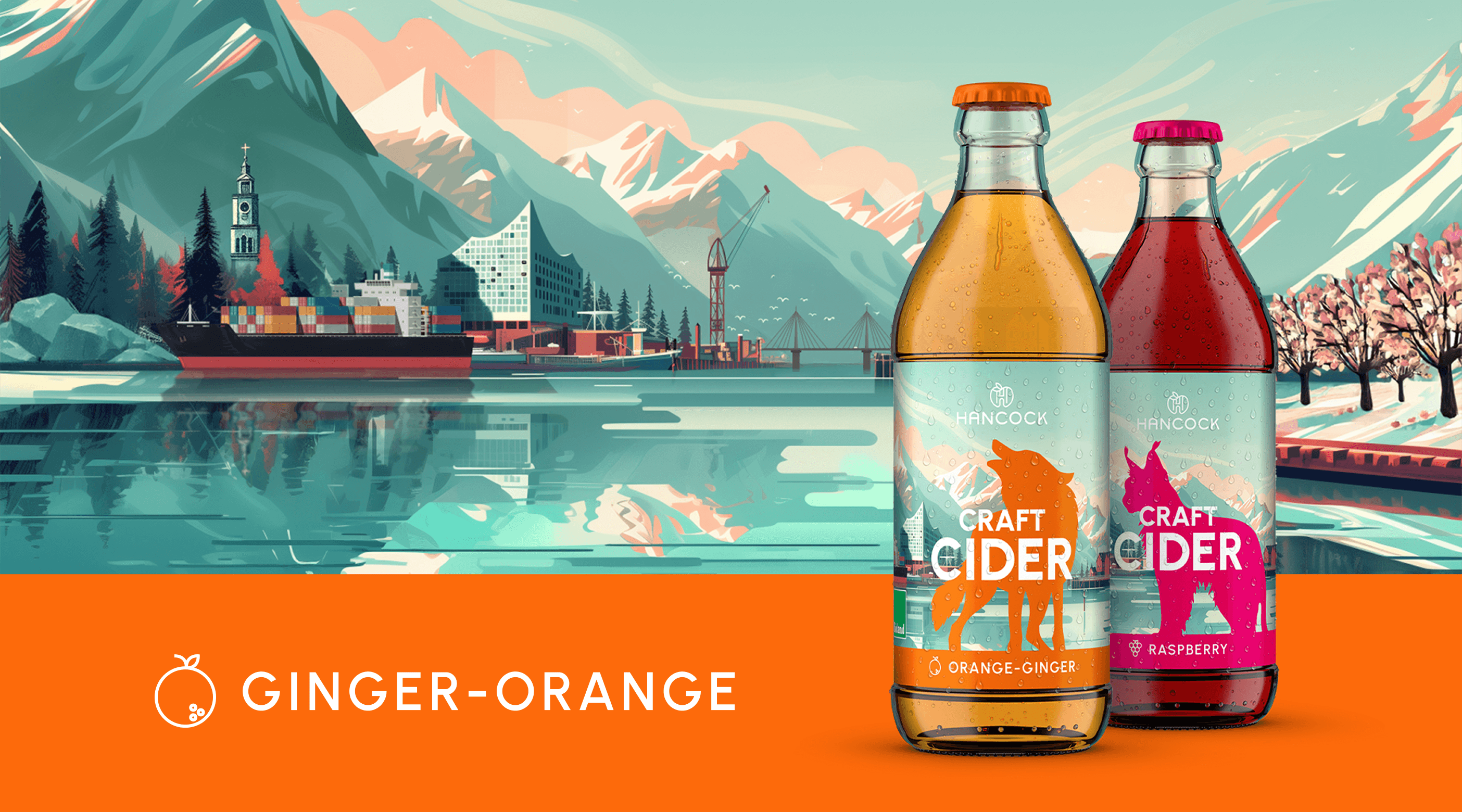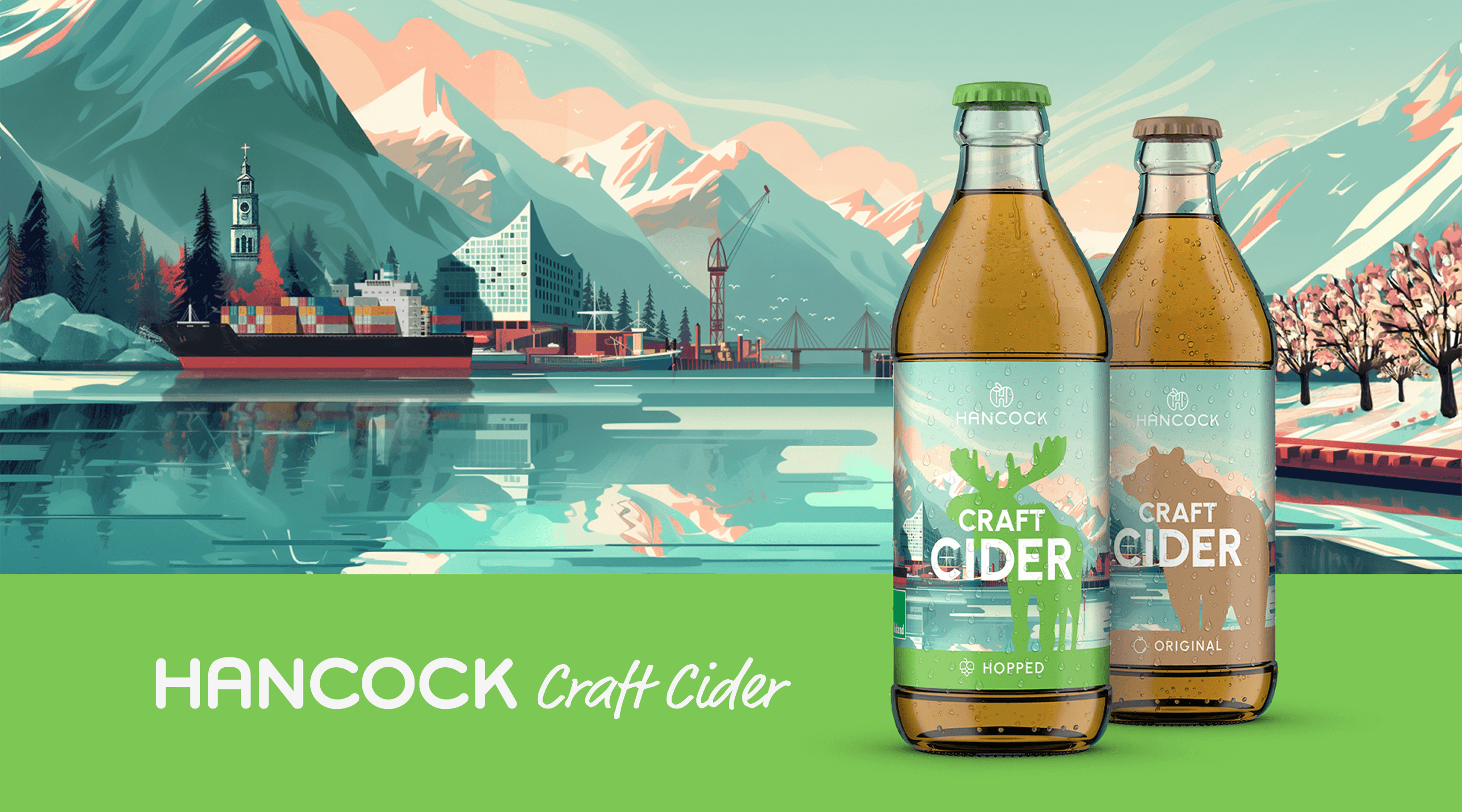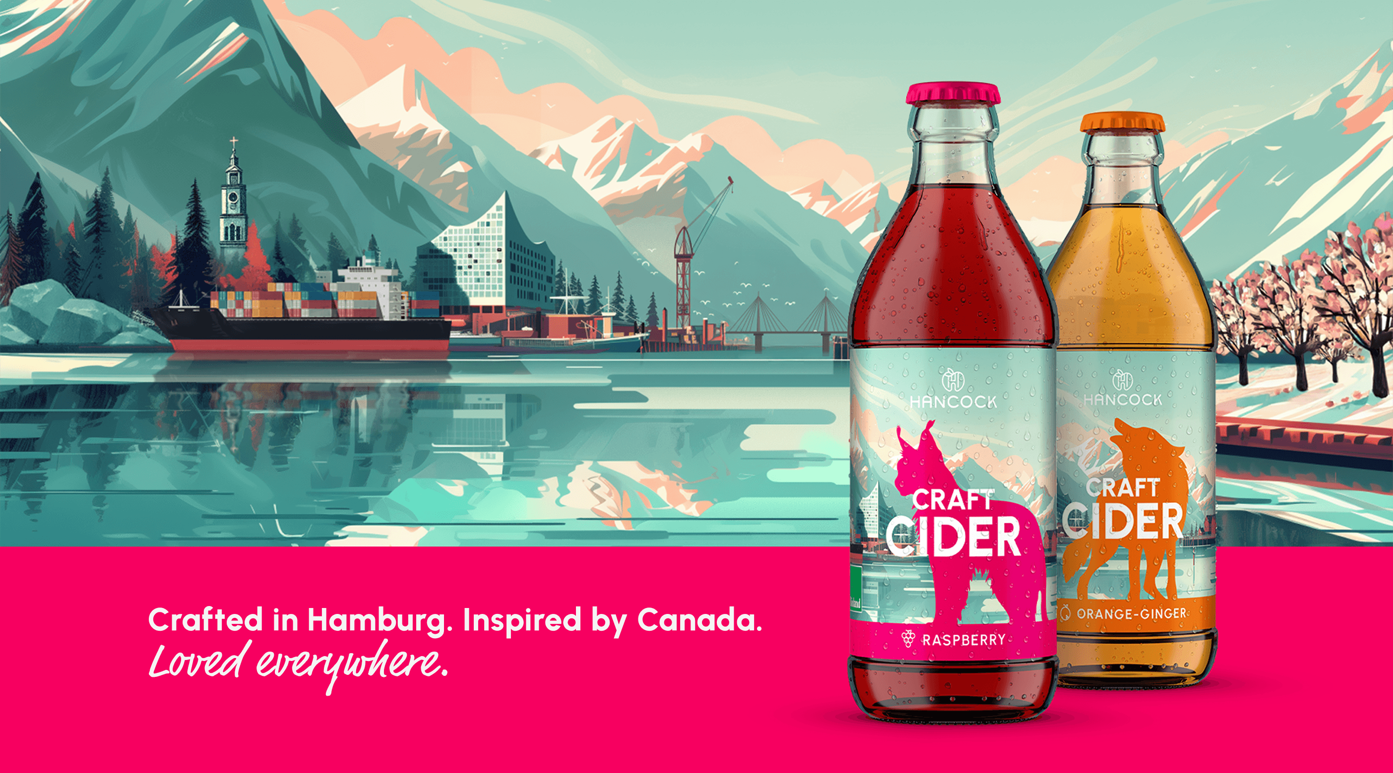 Wie verbindet man das raue Erbe Kanadas mit dem urbanen Flair Hamburgs? Für Hancock Craft Cider hat wertmarkeein Packaging-Design entwickelt, das geografische Grenzen visuell auflöst. Das Herzstück der Gestaltung ist ein KI-generiertes Key-Visual, das die markante Hamburger Stadtsilhouette – von der Elbphilharmonie bis zur Köhlbrandbrücke – nahtlos in die unberührte Natur des kanadischen Okanagan Valley einbettet.