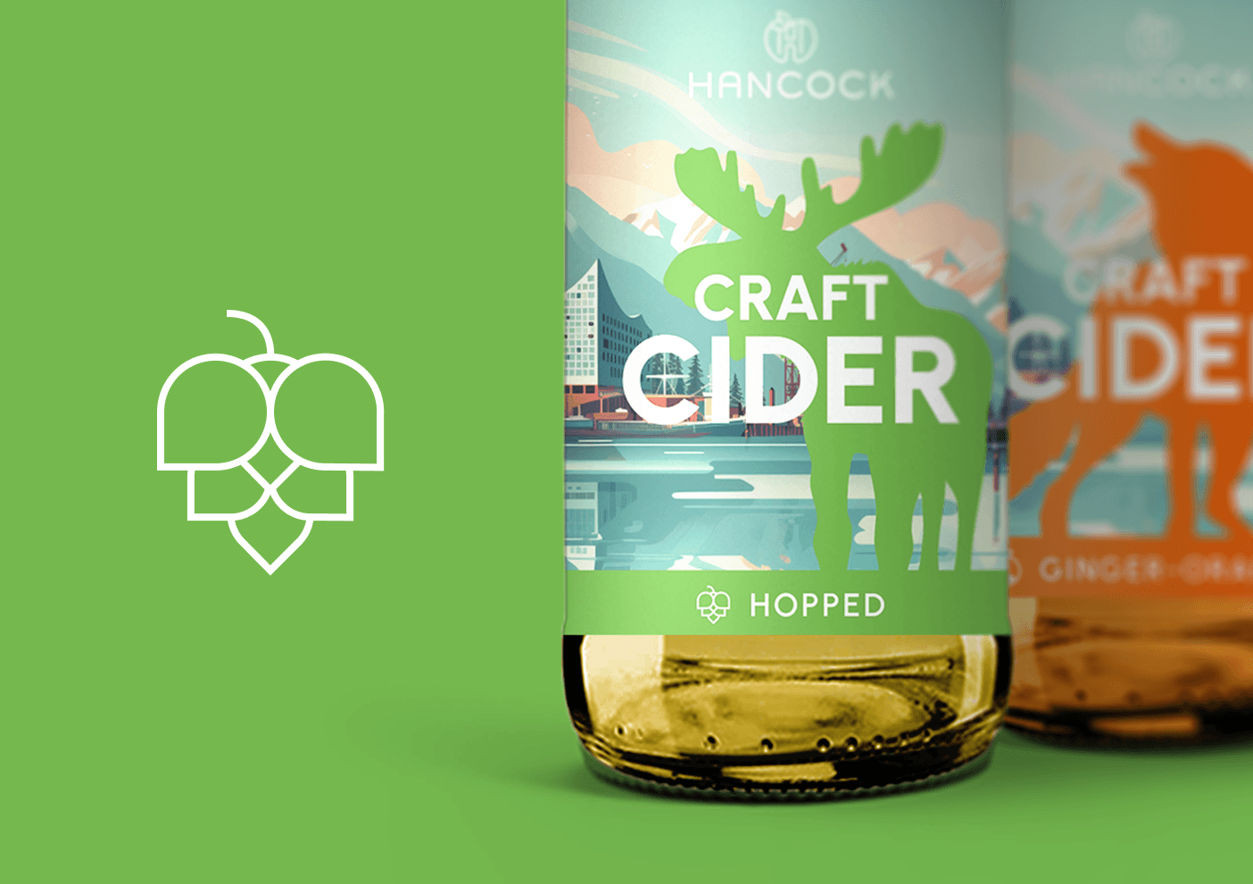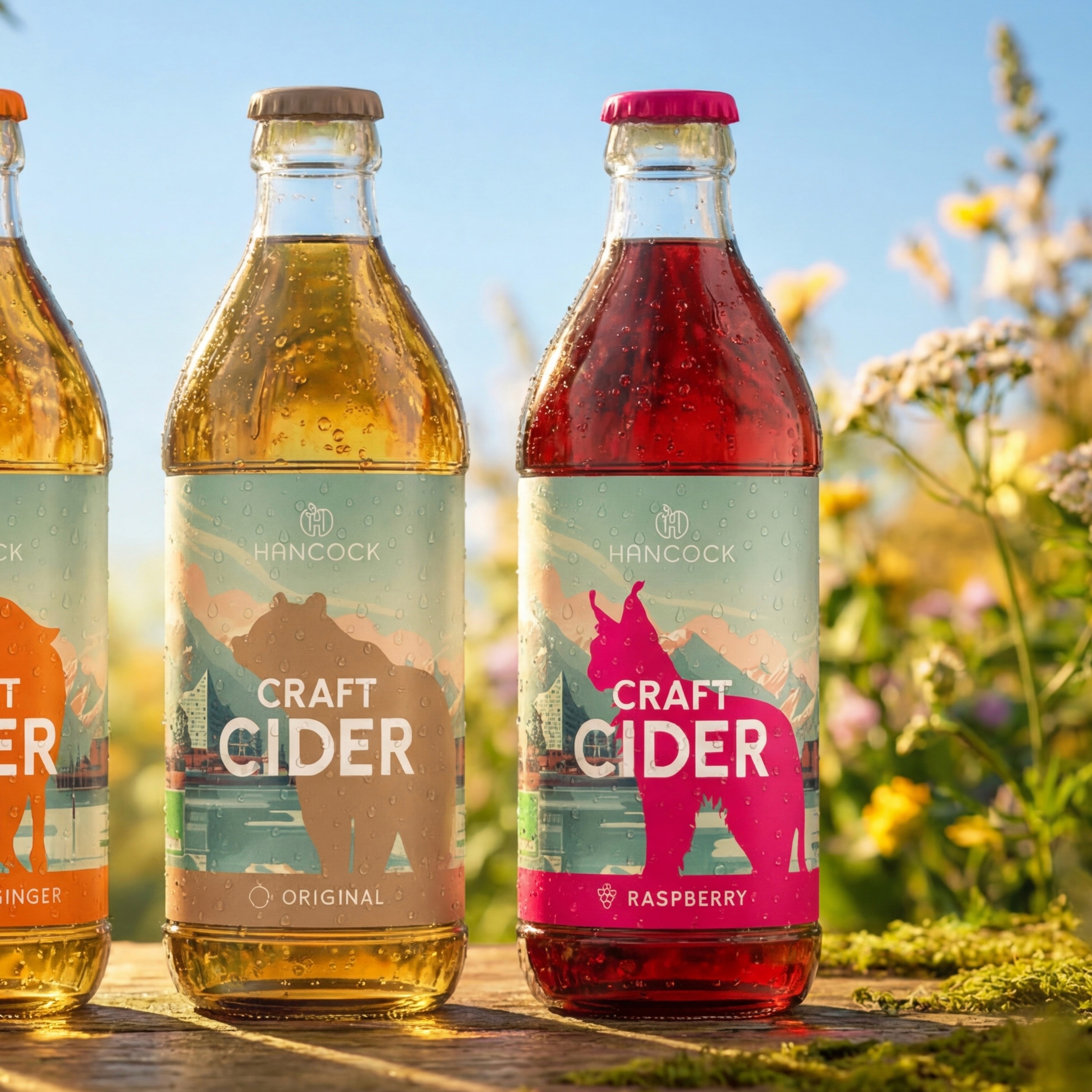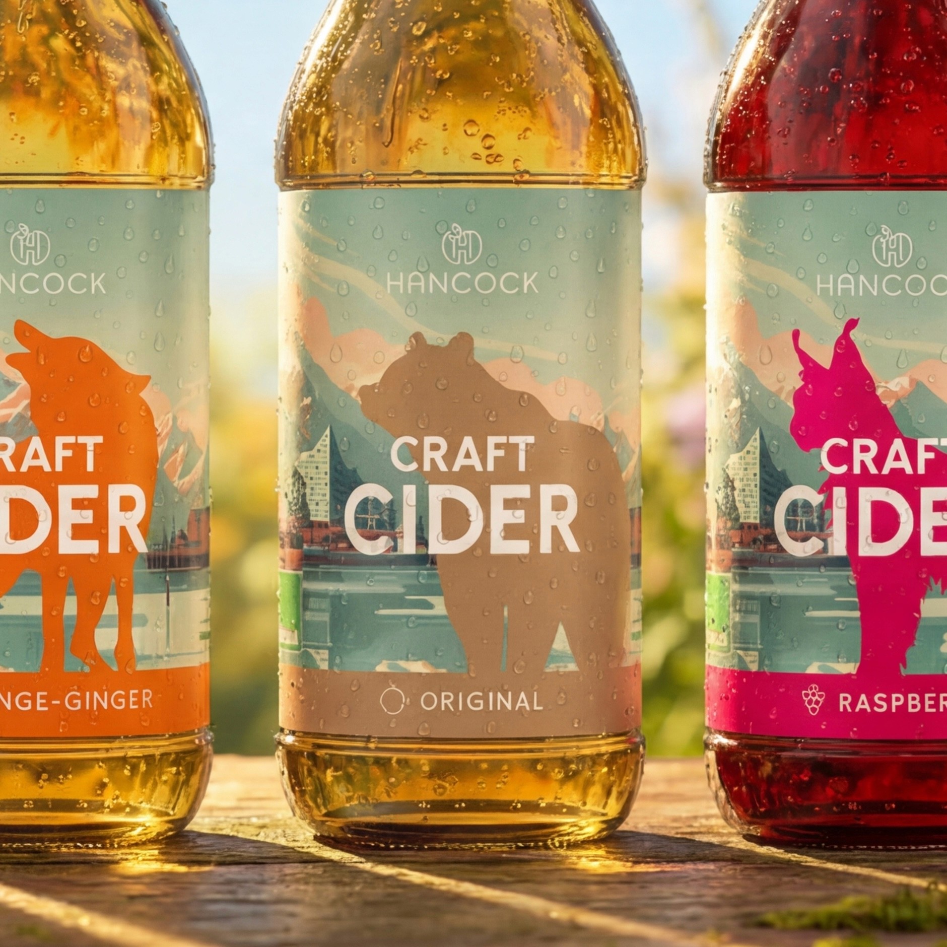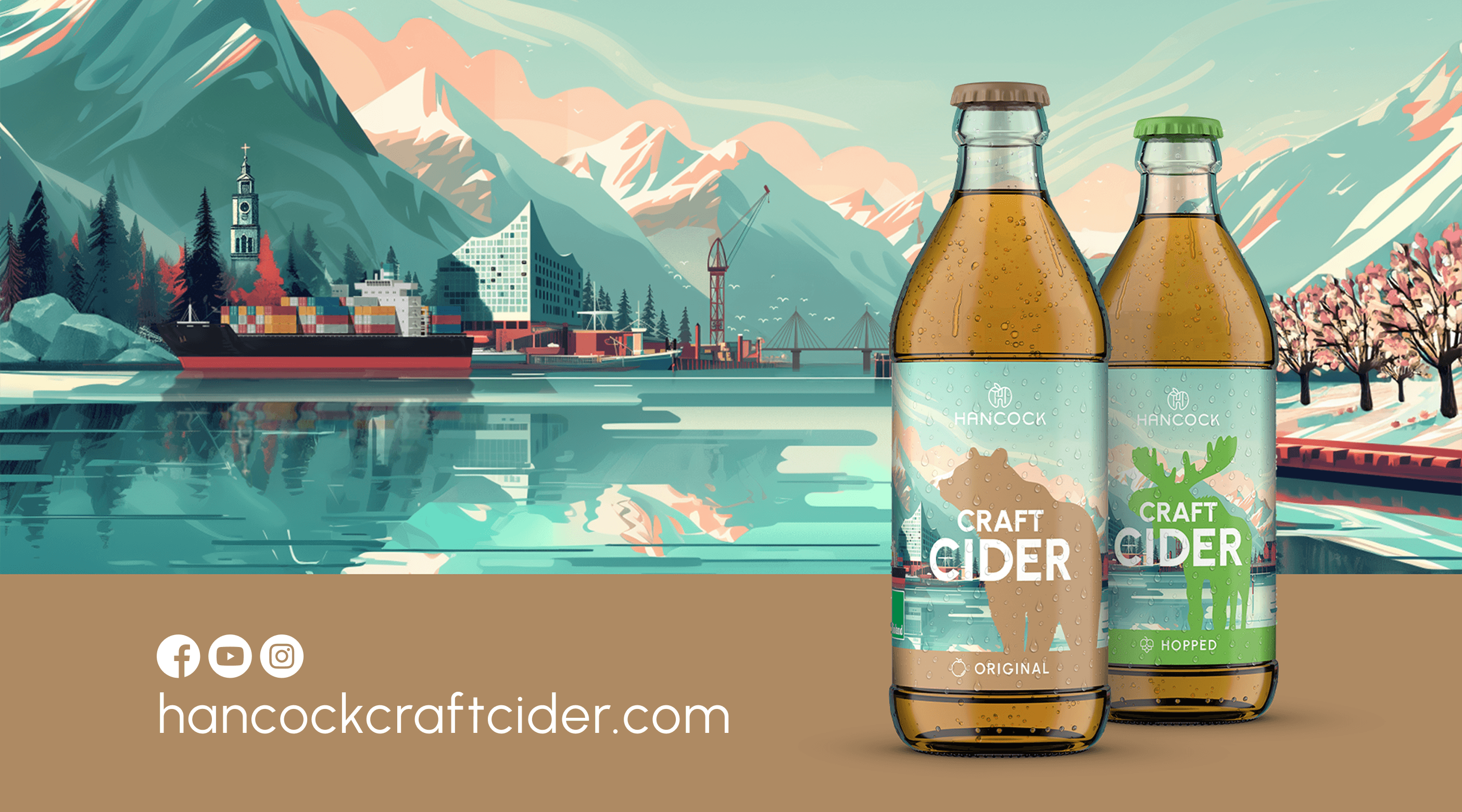 Wie verbindet man das raue Erbe Kanadas mit dem urbanen Flair Hamburgs? Für Hancock Craft Cider hat wertmarkeein Packaging-Design entwickelt, das geografische Grenzen visuell auflöst. Das Herzstück der Gestaltung ist ein KI-generiertes Key-Visual, das die markante Hamburger Stadtsilhouette – von der Elbphilharmonie bis zur Köhlbrandbrücke – nahtlos in die unberührte Natur des kanadischen Okanagan Valley einbettet.